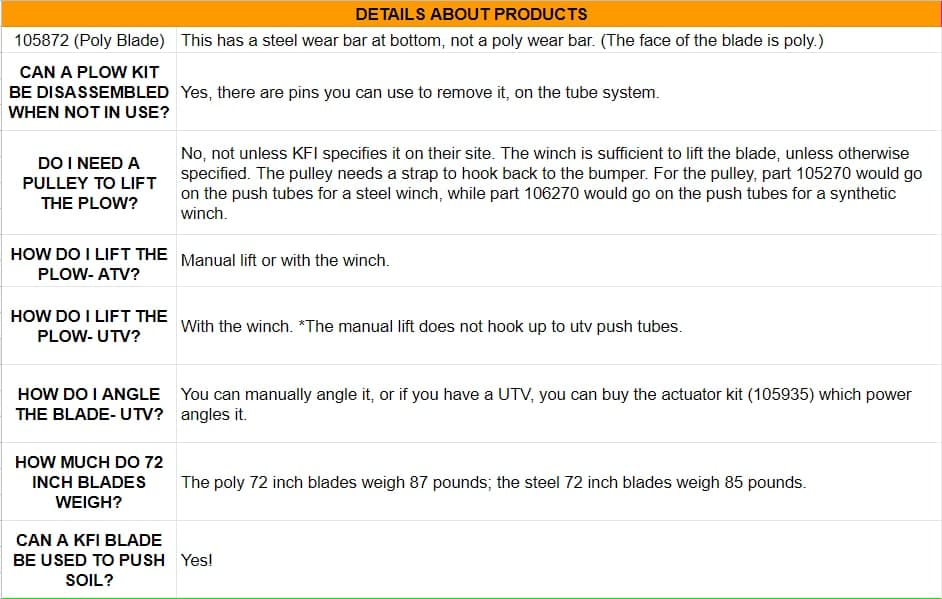 Have questions about how KFI kits work? Want to know the difference between steel and poly plow blades? Check out our KFI "Details About Products" and "Frequently Asked Questions" Charts! For further assistance, please reach out to our customer service team by calling or texting 888-927-3076 or use our online chat during business hours.